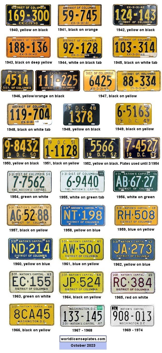 AboveBase Introduced Top Bottom Notes 186 and 356 890 1974 1776 BICENTENNIAL 1976 3-31 WASHINGTON,D.C. All embossed 735 289 1978 NATION'S CAPITAL WASHINGTON.D.C. All embossed 204 and 165 641 1985 A Capital City Washington, D.C. Registration embossed 759 411 1991 Celebrate & Discover Washington, D.C. Registration embossed AD 5064 1997 Washington, D.C. Celebrate & Discover Registration embossed AZ 6254 2000 Washington, D.C. TAXATION WITHOUT REPRESENTATION Registration embossed BG 3265 2001 Washington, D.C. TAXATION WITHOUT REPRESENTATION All flat BJ 1147 2001 Washington, D.C. www.washingtondc.gov All flat, alternative design DP 7160 2003 WASHINGTON, D.C. TAXATION WITHOUT REPRESENTATION All flat EP 0516 2013 DISTRICT OF COLUMBIA TAXATION WITHOUT REPRESENTATION All flat JD 3696 2017 WASHINGTON, D.C. END TAXATION WITHOUT REPRESENTATION All flat